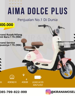 Rp 3.900.000 Rp 5.100.000SEPEDA LISTRIK AIMA DOLCE PLUS Spesifikasi : Motor Power : 500 Watt Baterai : Lead Acid 48V12Ah Jarak Tempuh : 40Km Kecepatan : 40Km/Jam Tersedia Warna : Abu-Abu, Hijau (Sebelum Checkout Kontak Admin Untuk Ketersediaan Warna)