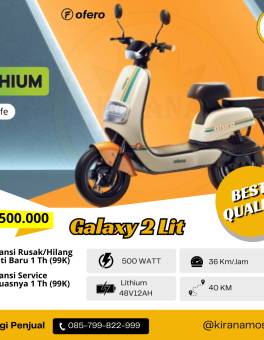 Rp 6.300.000TersediaOFERO E-BIKE GALAXY 2 LITHIUMSEPEDA LISTRIK OFERO GALAXY 2 LITHIUM Spesifikasi : Motor Power : 500 Watt Baterai : Lithium 48V12Ah Jarak Tempuh : 40Km Kecepatan : 36Km/Jam Tersedia Warna : Hijau, Violet (Sebelum Checkout Kontak Admin Untuk Ketersediaan Warna)