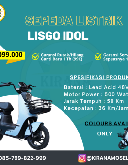 Rp 9.000.000SEPEDA LISTRIK LISGO IDOL Spesifikasi : Motor Power : 500 Watt Baterai : Lead Acid 48V20Ah Jarak Tempuh : 50Km Kecepatan : 36Km/Jam Tersedia Warna : Biru, Merah (Sebelum Checkout Kontak Admin Untuk Ketersediaan Warna)