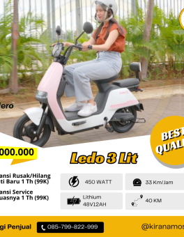 Rp 3.600.000SEPEDA LISTRIK OFERO LEDO 3 LITHIUM Spesifikasi : Motor Power : 450 Watt Baterai : Lithium 48V12Ah Jarak Tempuh : 40Km Kecepatan : 33Km/Jam Tersedia Warna : Hitam, Hijau, Pink (Sebelum Checkout Kontak Admin Untuk Ketersediaan Warna)