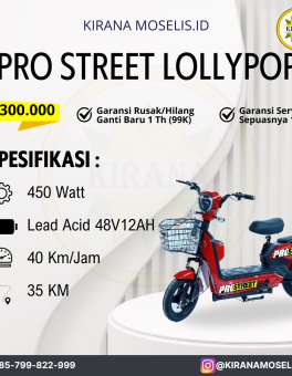 SEPEDA LISTRIK PRO STREET LOLLYPOP Spesifikasi : Motor Power : 450 Watt Baterai : Lead Acid 48V12Ah Jarak Tempuh : 35Km Kecepatan : 40Km/Jam Tersedia Warna : Biru, Kuning, Hijau, Cream, Pink (Sebelum Checkout Kontak Admin Untuk Ketersediaan Warna)