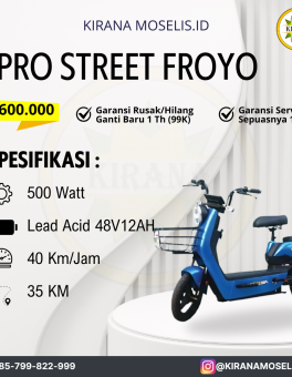 Rp 3.300.000SEPEDA LISTRIK PRO STREET FROYO Spesifikasi : Motor Power : 500 Watt Baterai : Lead Acid 48V12Ah Jarak Tempuh : 35Km Kecepatan : 40Km/Jam Tersedia Warna : Cream, Hijau, Biru, Kuning, Pink, Violet, Hitam, Merah (Sebelum Checkout Kontak Admin Untuk Ketersediaan Warna)