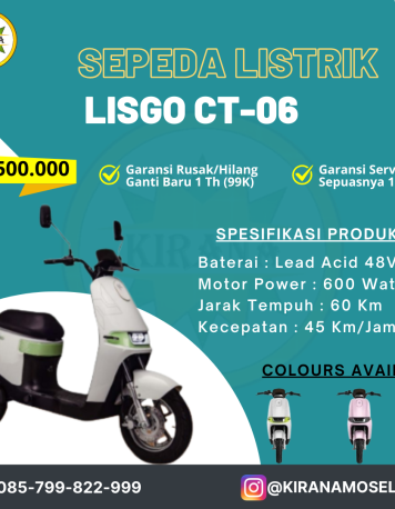 Rp 3.400.000SEPEDA LISTRIK GODA LEMON Spesifikasi : Motor Power : 600 Watt Baterai : Lead Acid 48V12Ah Jarak Tempuh : 40Km Kecepatan : 40Km/Jam Tersedia Warna : Pink, Putih, Hijau (Sebelum Checkout Kontak Admin Untuk Ketersediaan Warna)