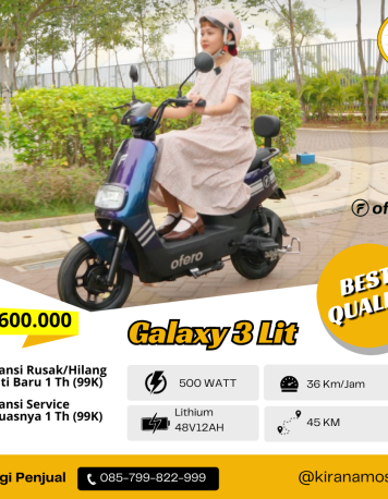Rp 8.600.000SEPEDA LISTRIK OFERO GALAXY 2 LITHIUM Spesifikasi : Motor Power : 500 Watt Baterai : Lithium 48V12Ah Jarak Tempuh : 40Km Kecepatan : 36Km/Jam Tersedia Warna : Hijau, Violet (Sebelum Checkout Kontak Admin Untuk Ketersediaan Warna)
