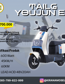 Rp 3.400.000SEPEDA LISTRIK TAILG YOUJUN EB Spesifikasi : Motor Power : 600 Watt Baterai : Lead Acid 48V20Ah Jarak Tempuh : 60Km Kecepatan : 45Km/Jam Tersedia Warna : Kuning, Abu, Biru (Sebelum Checkout Kontak Admin Untuk Ketersediaan Warna)