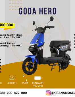 Rp 7.700.000SEPEDA LISTRIK GODA HERO Spesifikasi : Motor Power : 650 Watt Baterai : Lead Acid 48V12Ah Jarak Tempuh : 45Km Kecepatan : 40Km/Jam Tersedia Warna : Biru, Hijau, Putih, Merah (Sebelum Checkout Kontak Admin Untuk Ketersediaan Warna)