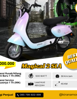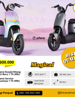 Rp 6.000.000SEPEDA LISTRIK OFERO MAGICAL Spesifikasi : Motor Power : 500 Watt Baterai : Lead Acid 48V12Ah Jarak Tempuh : 60Km Kecepatan : 36Km/Jam Tersedia Warna : Hijau, Abu, Pink (Sebelum Checkout Kontak Admin Untuk Ketersediaan Warna)