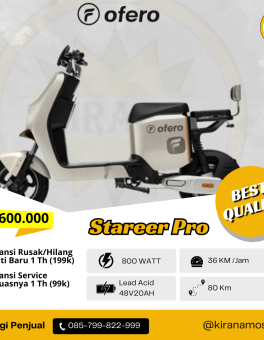Rp 19.500.000SEPEDA LISTRIK OFERO STAREER PRO Spesifikasi : Motor Power : 800 Watt Baterai : Lead Acid 48V20Ah Jarak Tempuh : 80Km Kecepatan : 36Km/Jam Tersedia Warna : Putih