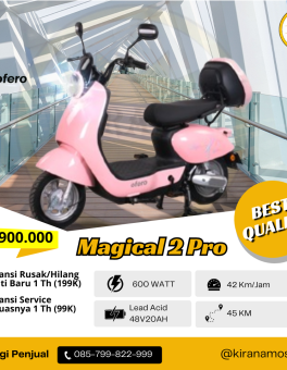 Rp 7.900.000SEPEDA LISTRIK OFERO MAGICAL 2 PRO Spesifikasi : Motor Power : 600 Watt Baterai : Lead Acid 48V20Ah Jarak Tempuh : 45Km Kecepatan : 42Km/Jam Tersedia Warna : Pink, Abu (Sebelum Checkout Kontak Admin Untuk Ketersediaan Warna)
