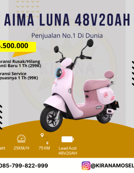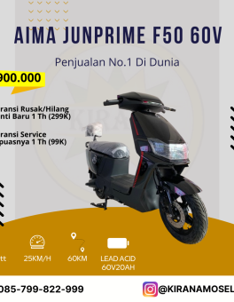 Rp 3.500.000SEPEDA LISTRIK AIMA JUNPRIME F50-60 Spesifikasi : Motor Power : 800 Watt Baterai : Lead Acid 60V20Ah Jarak Tempuh : 60Km Kecepatan : 25Km/Jam Tersedia Warna : Abu Ilusi, Abu Camar, Biru, Hitam (Sebelum Checkout Kontak Admin Untuk Ketersediaan Warna)