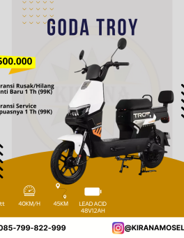 Rp 4.400.000SEPEDA LISTRIK GODA TROY Spesifikasi : Motor Power : 550 Watt Baterai : Lead Acid 48V12Ah Jarak Tempuh : 45Km Kecepatan : 40Km/Jam Tersedia Warna : Merah, Putih, Hitam (Sebelum Checkout Kontak Admin Untuk Ketersediaan Warna)
