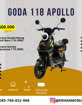 Rp 4.400.000SEPEDA LISTRIK GODA 118 APOLLO Spesifikasi : Motor Power : 600 Watt Baterai : Lead Acid 48V12Ah Jarak Tempuh : 40Km Kecepatan : 40Km/Jam Tersedia Warna : Merah, Putih, Hitam (Sebelum Checkout Kontak Admin Untuk Ketersediaan Warna)
