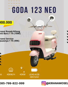 Rp 2.900.000SEPEDA LISTRIK GODA 123 NEO Spesifikasi : Motor Power : 600 Watt Baterai : Lead Acid 48V12Ah Jarak Tempuh : 40Km Kecepatan : 40Km/Jam Tersedia Warna : Putih, Pink, Kuning, Hijau (Sebelum Checkout Kontak Admin Untuk Ketersediaan Warna)